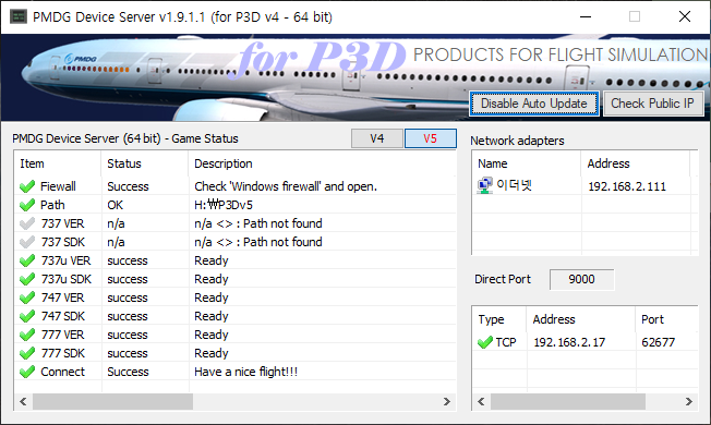 Make sure the PMDG device server version is 1.9.1.1